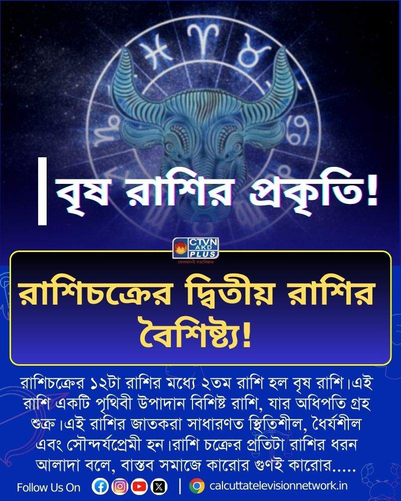 রাশিচক্রের ১২টা রাশির মধ্যে ২তম রাশি হল বৃষ রাশি। এই রাশি একটি পৃথিবী উপাদান বিশিষ্ট রাশি, যার অধিপতি গ্রহ শুক্র। এই রাশির জাতকরা সাধারণত স্থিতিশীল, ধৈর্যশীল এবং সৌন্দর্যপ্রেমী হন। রাশি চক্রের প্রতিটা রাশির ধরন আলাদা বলে, বাস্তব সমাজে কারোর গুণই কারোর সঙ্গে কোনো মিল নেই। এক কথায় বলতে গেলে, সবাই নিজ নিজ স্থানে থেকে সেরা। চলুন তাহলে জেনে নেওয়া যাক, বৃষ রাশির মানুষেরা কেমন প্রকৃতির হয়? প্রাথমিকভাবে, এই রাশির ইতিবাচক বৈশিষ্ট্য বলতে এঁরা খুব ধৈর্যশীল প্রকৃতির হয়। সময় নিয়ে কাজ করতে ভালোবাসে, তাড়াহুড়ো নয়। এই রাশির জাতকেরা খুবই বিশ্বাসযোগ্য হন। এঁরা সুন্দরের প্রতি আগ্রহী হন। এঁরা যেকোনো কিছুতে স্থিতিশীলতা পছন্দ করে এবং ভীষণ পরিশ্রমী হন।