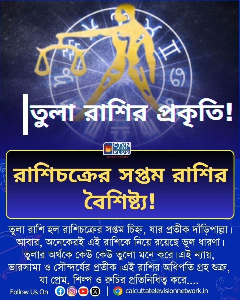 তুলা রাশি হল রাশিচক্রের সপ্তম চিহ্ন, যার প্রতীক দাঁড়িপাল্লা। আবার, অনেকেরই এই রাশিকে নিয়ে রয়েছে ভুল ধারণা। তুলার অর্থকে কেউ কেউ তুলো মনে করে। এই ন্যায়, ভারসাম্য ও সৌন্দর্যের প্রতীক। এই রাশির অধিপতি গ্রহ শুক্র, যা প্রেম, শিল্প ও রুচির প্রতিনিধিত্ব করে। তুলা রাশির ব্যক্তিত্বে থাকে একধরনের শান্ত, রুচিশীল ও কূটনৈতিক গুণ, যা তাঁদের সহজেই মানুষের প্রিয় করে তোলে। চলুন তাহলে জেনে নেওয়া যাক এই রাশির মানুষেরা কেমন হয়? এই রাশির ইতিবাচক বৈশিষ্ট্য বলতে, এঁরা সাম্য ও ন্যায়ের প্রতি আকর্ষিতবোধ করে। অর্থাৎ, অন্যায়ের বিরুদ্ধে অবস্থান নেয়, ভারসাম্য বজায় রাখতে চায়। সামাজিক ও বন্ধুত্বপূর্ণ সম্পর্ক সহজেই মানুষের সঙ্গে মিশে যায়, সম্পর্ক গড়তে দক্ষ হয়। এঁরা খুব শৈল্পিক ও রুচিশীল হয়। অর্থাৎ, সৌন্দর্য, ফ্যাশন, সংগীত ও শিল্পকলার প্রতি আগ্রহ দেখান। এঁরা দ্বন্দ্ব এড়িয়ে শান্তিপূর্ণ সমাধান খোঁজে।নিঃসন্দেহে বলা যায়, এঁরা যুক্তিবাদী ও মিষ্টভাষী হয়।
